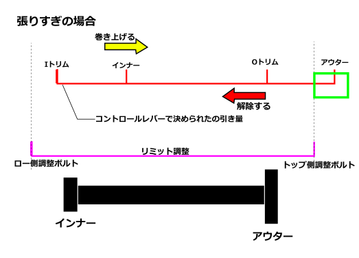 ケーブルのテンションがパンパンの時に更に引っ張る動きは力が入りますのでケーブルを緩めて調整したげるということです。