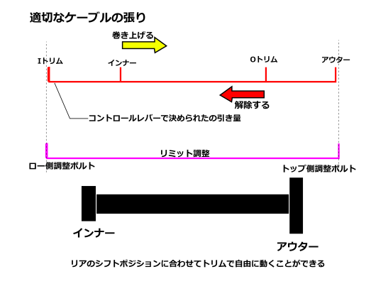リアは逆にロー側(内側・大きなギア)よりの時はケーブルが張られている状態なわけです。
