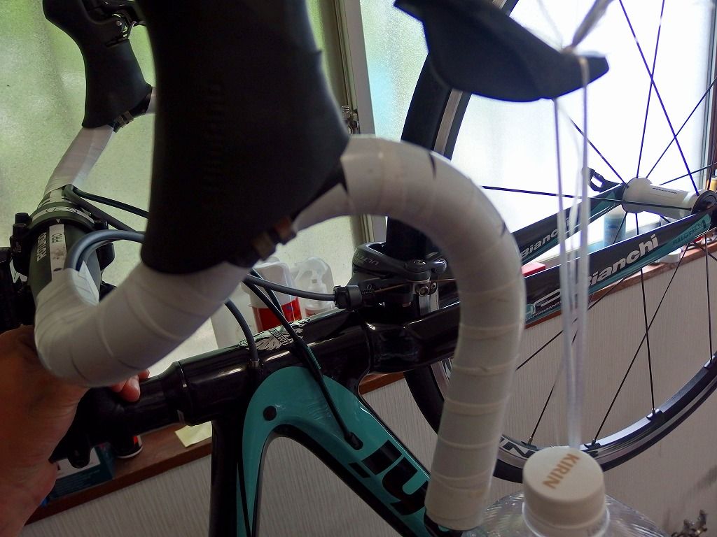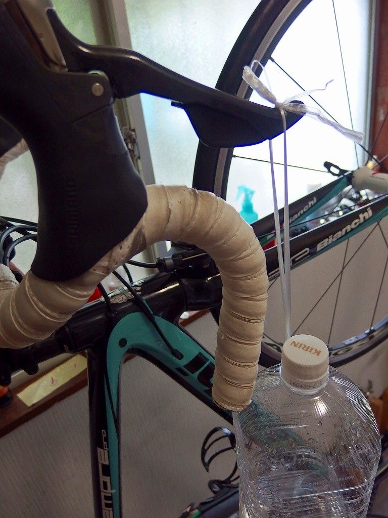 自転車を90度起こしブレーキレバーにこれをぶら下げます。