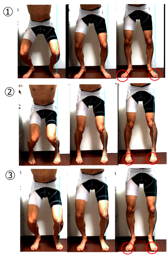 あとは内股・がに股が癖になっている方、ペダリングの時に癖が出てしまうことです。多少は癖が出てもパワーを掛ければ体側が自然に修正をしてくれるのですが、修正しきれなくなった時にはやはり上記2点のように修正をかけてあげることが必要になります。