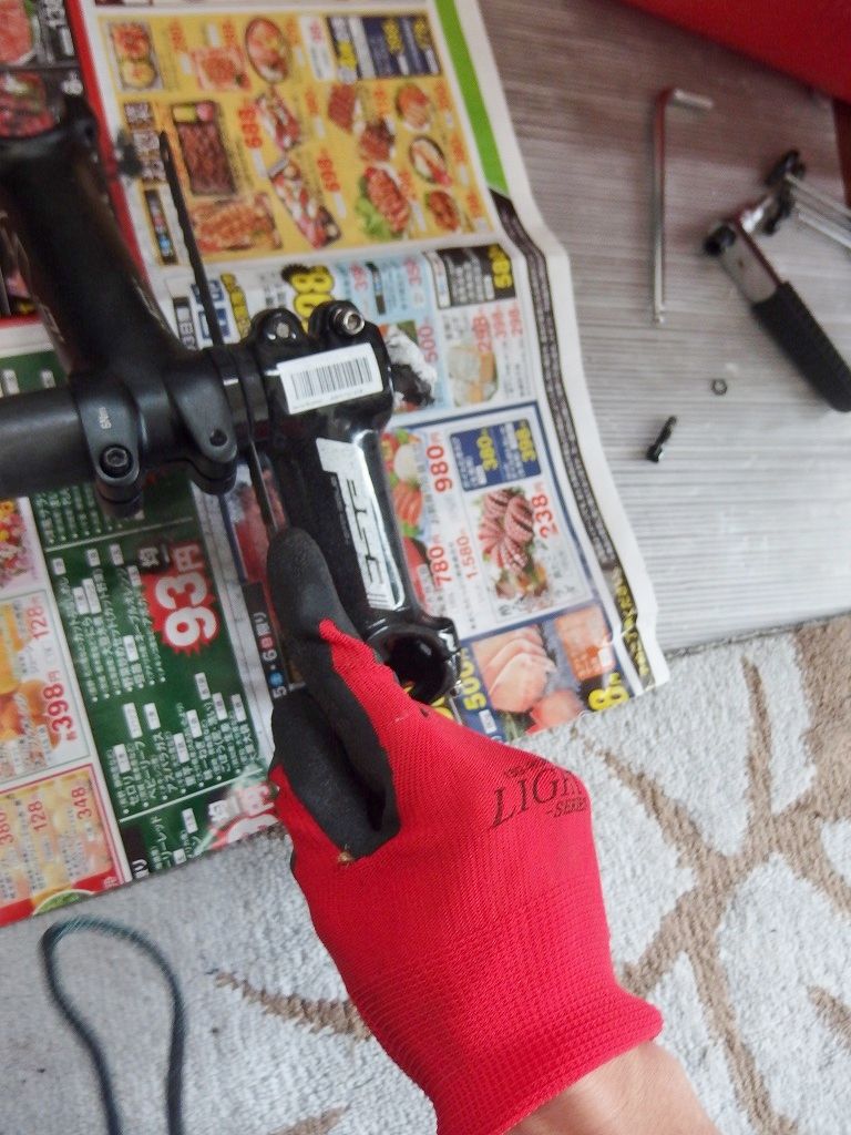右側はBianchi純正のカーボンラップのステムです。全く使ったことも使う予定もないんですが、流石にこいつに直接刃を当てるのは気が引けてしまうので、イラないアルミ製のスペーサーを2枚はさみます。