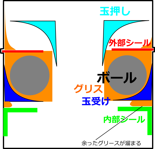 そのうち内部シールと玉受けの間に余分なグリスは移動していきます。