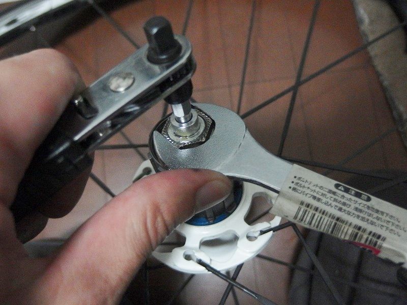 17mmのスパナで抑えて六角で逆ネジ方向にゆるめます。