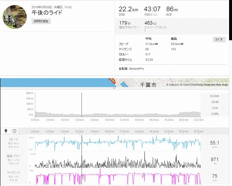 まずは基本となる【サイコンとセンサー】(センサーダイレクトモード)のデータです。