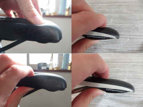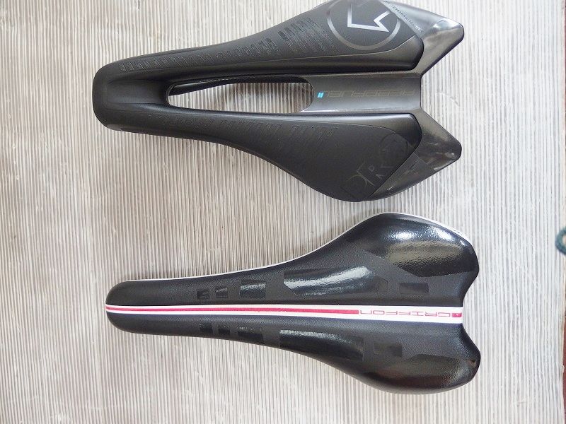 で本題ですが、何が違うのかというと、明確にこれと言った決め手があるわけではないのですが、強いて言うなら深い前傾・TTポジションを取りやすいように、サドル先端まで厚みのあるパッドが入っている。先端がが若干短め、深い前傾のときの会陰部の圧迫を防ぐための大きな溝、このぐらいでしょうか。