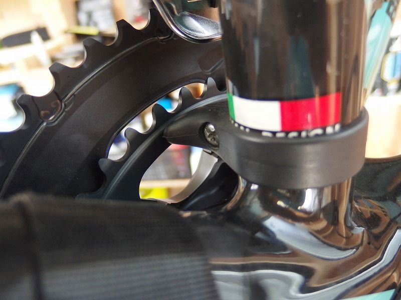 アウターチェーリングには”チェーン落ち防止ピン”がありますが、ちょうどクランクで隠れるようになります。