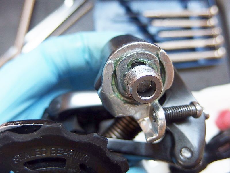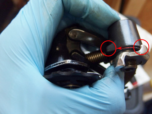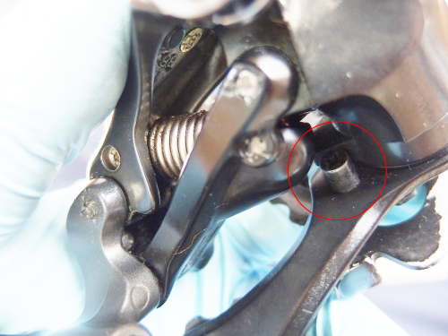 ストッパーピンが止めの役割になっていた方向に回るようになりますのでそちらに回して緩めてあげます。というところなんですが、少々ディレイラーに引っかかりますのでそこは優しく本体をバネの力に逆らって動かして上げるといいでしょう。