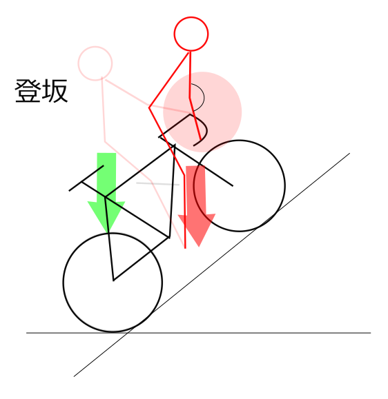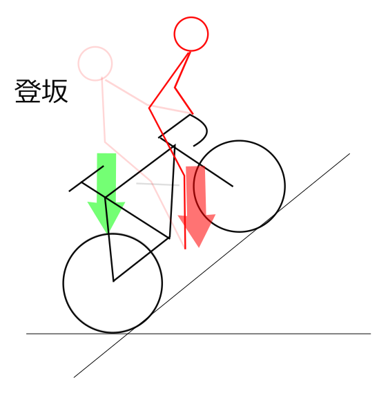 平地と同じフォームでは多分後ろに転がって(まくって)しまいます。