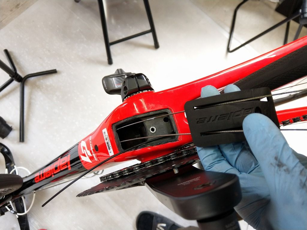 ゼリウスはダウンチューブ内でインナーがクロスしますので、変に絡んでいないかしっかりと目視で確認しながら作業ができます。