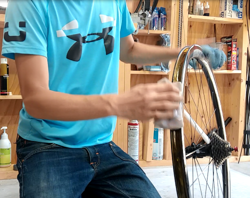 ここで塗るのはリムの内側が濡れていないと組み付けの時にゴムが滑らないです。