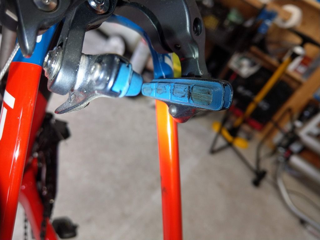 これがシュー自体の動きのせいなのんか、ブレーキ本体の歪みなのかは不明です。