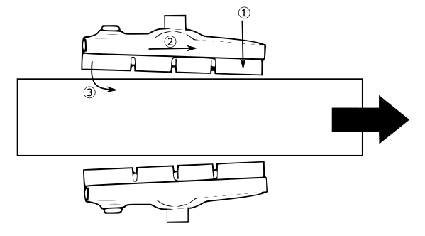 シューが押し付けられてもリムは進行方向へ動いています。①