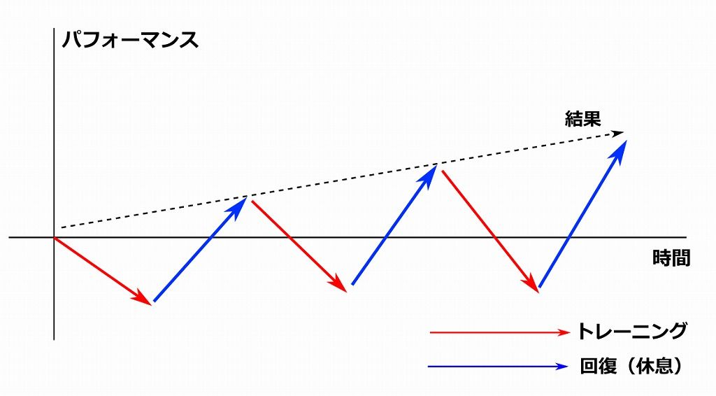 過剰なトレーニングはパフォーマンスの低下が現れますが、その後十分に回復させることでパフォーマンスを伸ばしていくという方法です。
