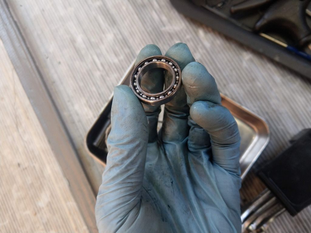 でスナップリングが外れたら、内側のベアリングをまっすぐ抜きますが、ここで失敗するとまずいです。また少々深い位置にベアリングがありますので、ちょっとだけ面倒くさいです。