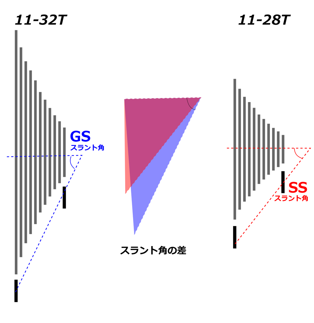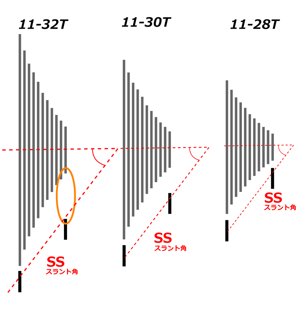 理論的に考えると、14-32Tの組み合わせだとSSでもいいかと思います。実際に見れみないとなんともいい難いところはありますが、、、ロー側を大きくする際のトップ側での変速の悪さは11や12Tなどトップ側のギア物理的なサイズの問題であると考えるからです。本文中の説明のとおりです。