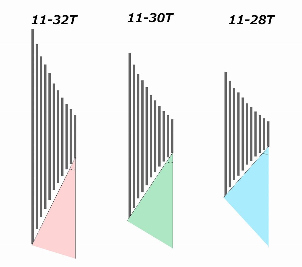 逆にクロスレシオ、ロー側が小さくトップとの歯数差が少ないほうが角度が大きくなります。