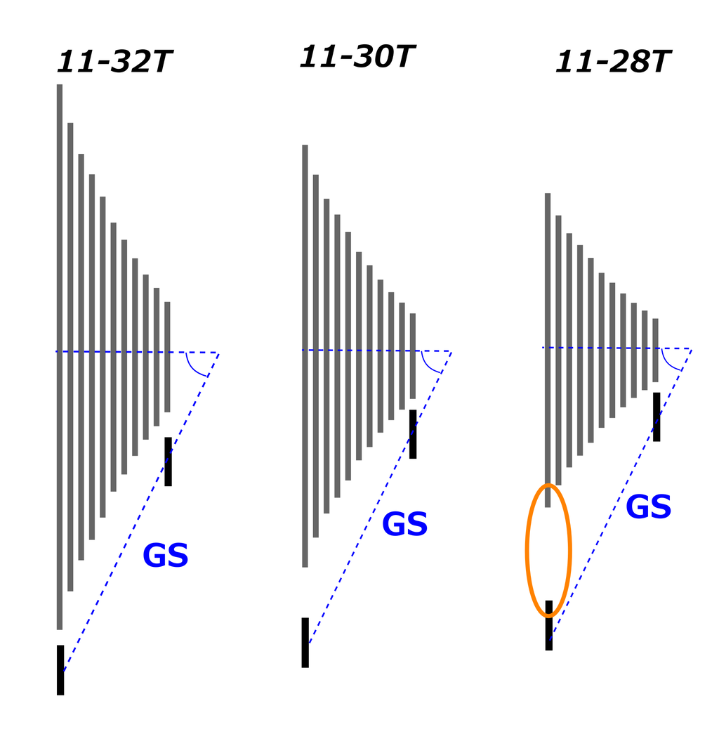 いわゆるワイドレシオ(レンジ)のカセットスプロケットのほうが角度が鋭くなるということです。