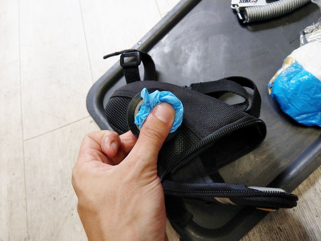 ビニテの芯の中に手袋をいれます。