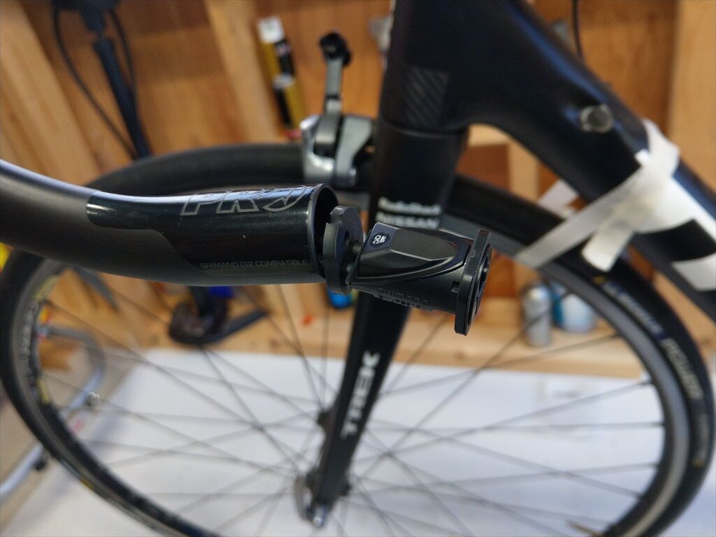 このハンドル、クランプ部の幅もさることながら、ステムの右側につけると後方にせり出したフラット部の影響で、ディスプレイが見えないぐらいの角度になります(笑)