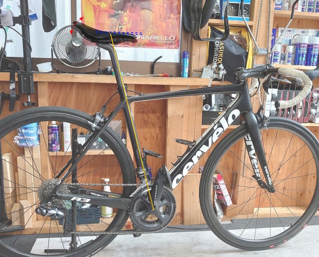 通常サドルの上下で高さを合わせた後、サドルを前後の動かすことで、ペダル軸に対しての位置を決めます。(サドルの前後位置が極端に変わる場合は再度高さも見たほうが良い場合もあります。)