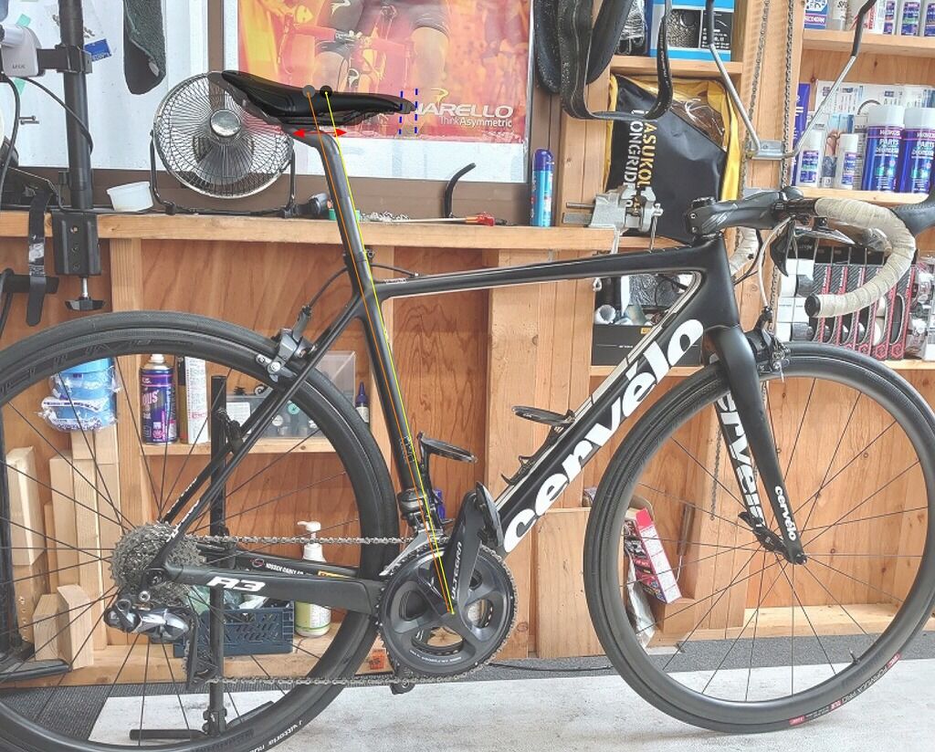 ※サドルの前後位置調整で限界を超えてしまう場合はシートポストをオフセットが違うものに交換することで対応できる場合もあります。