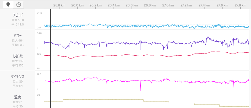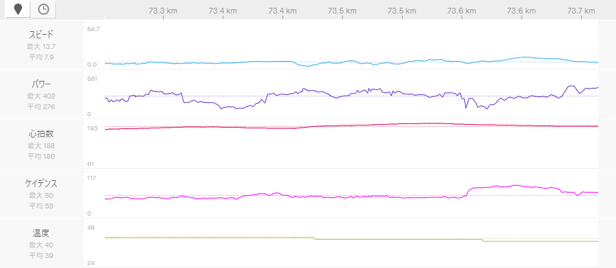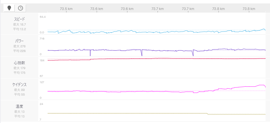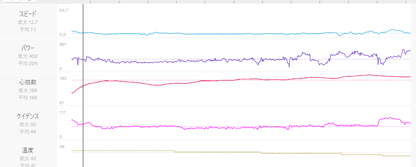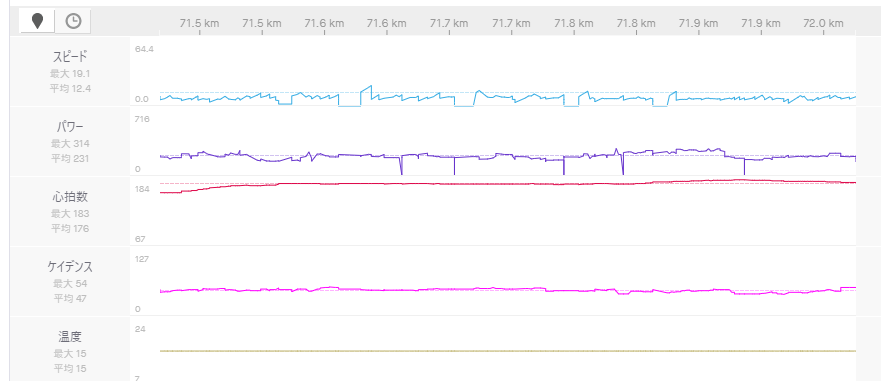 もう少しギアを軽いものを使うことで、パワーを削減し、今回の数値よりも低いPWRでも上ることは可能になることもあります。