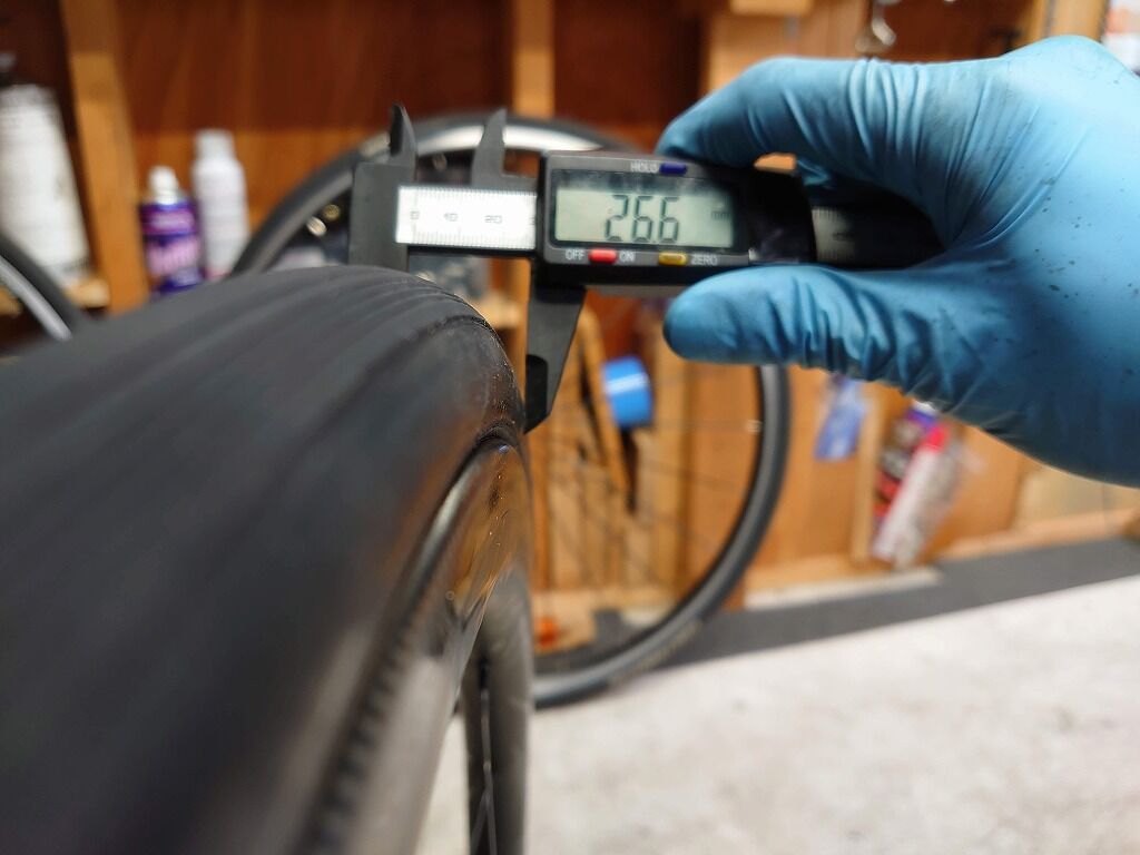 内幅20mmのワイドリムに取り付けて、空気圧6.5BAR、実測で幅26.6mmでした。