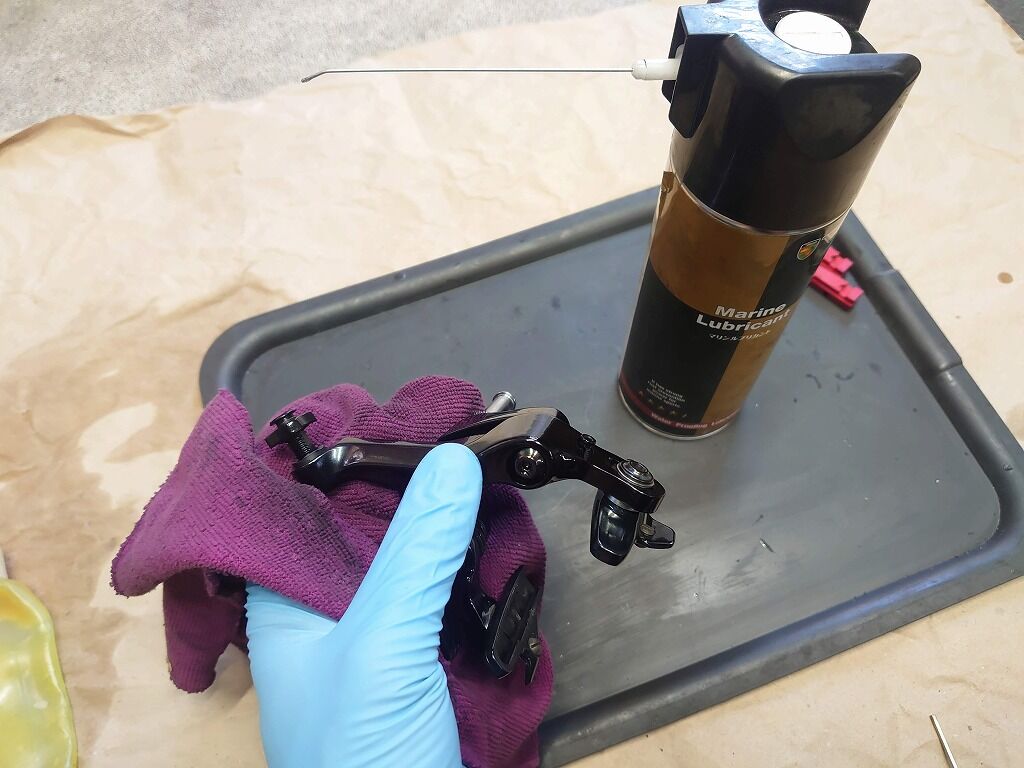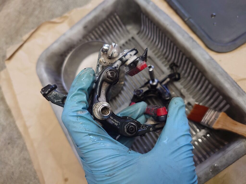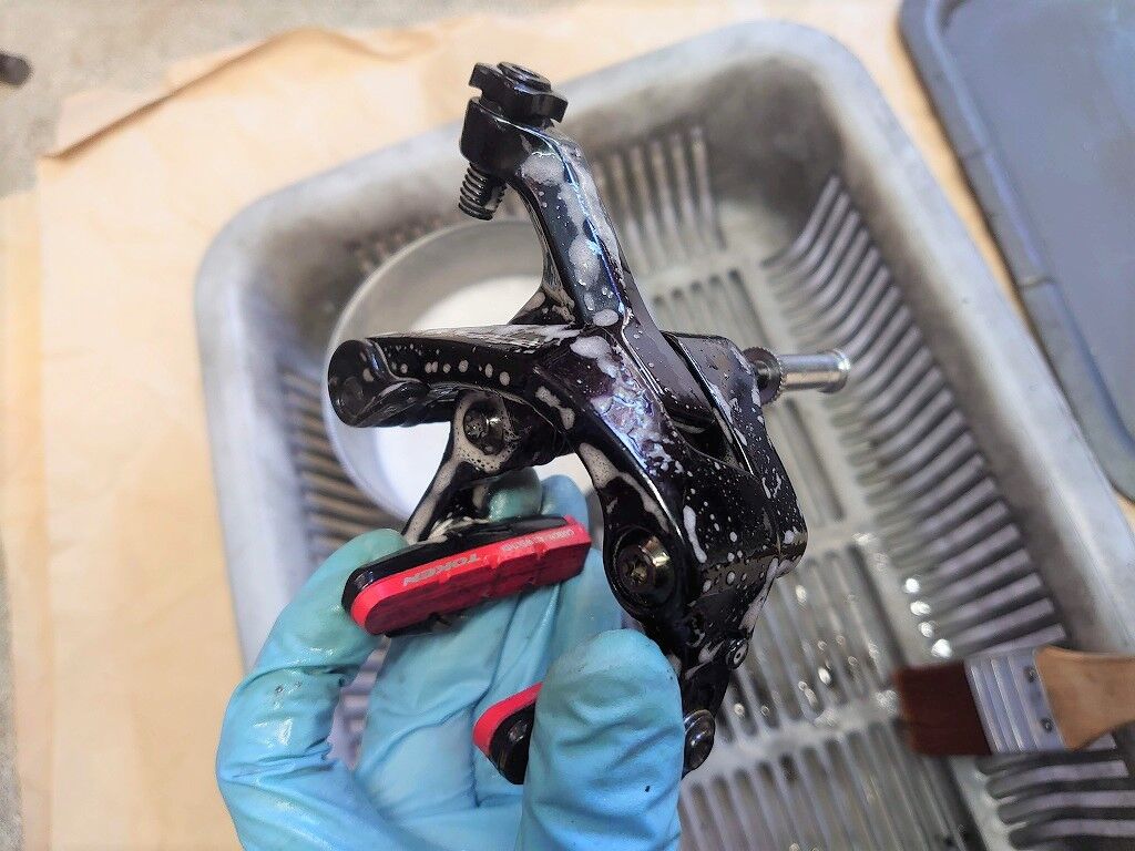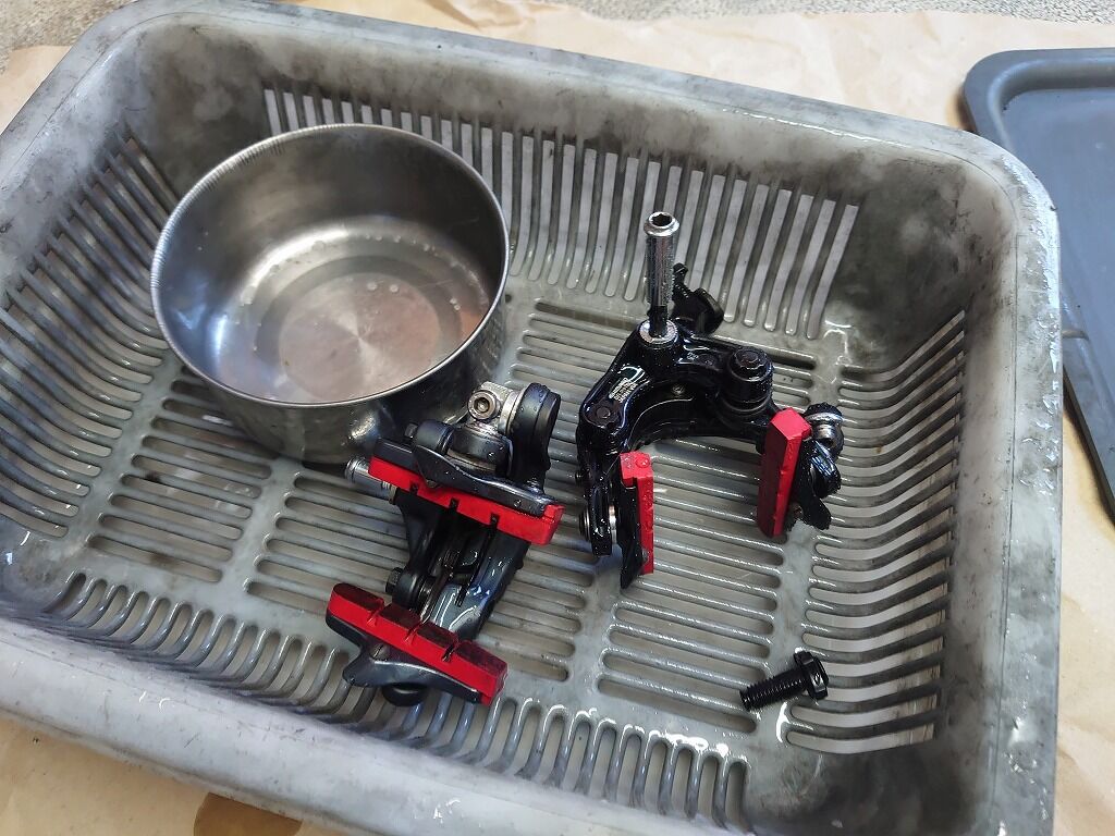 ブレーキの主な汚れはブレーキダストや泥汚れです。ディレイラーなどのドライブトレインとは違って、油汚れがすごいわけでは有りませんので掃除にはディグリーザー等の強い洗浄剤を使わなくても、中性洗剤でも十分にキレイにできます。