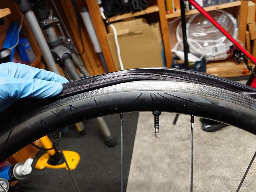 ただしVittoriaのビード上げはノーマルのコルサもそうですが少々上がりにくいので(充填時エアが漏れがち)、コアを外して一気に充填しきっかけを作って上げれば簡単に上がります。