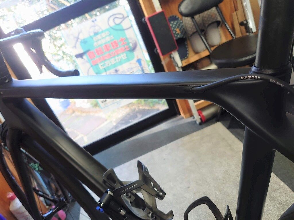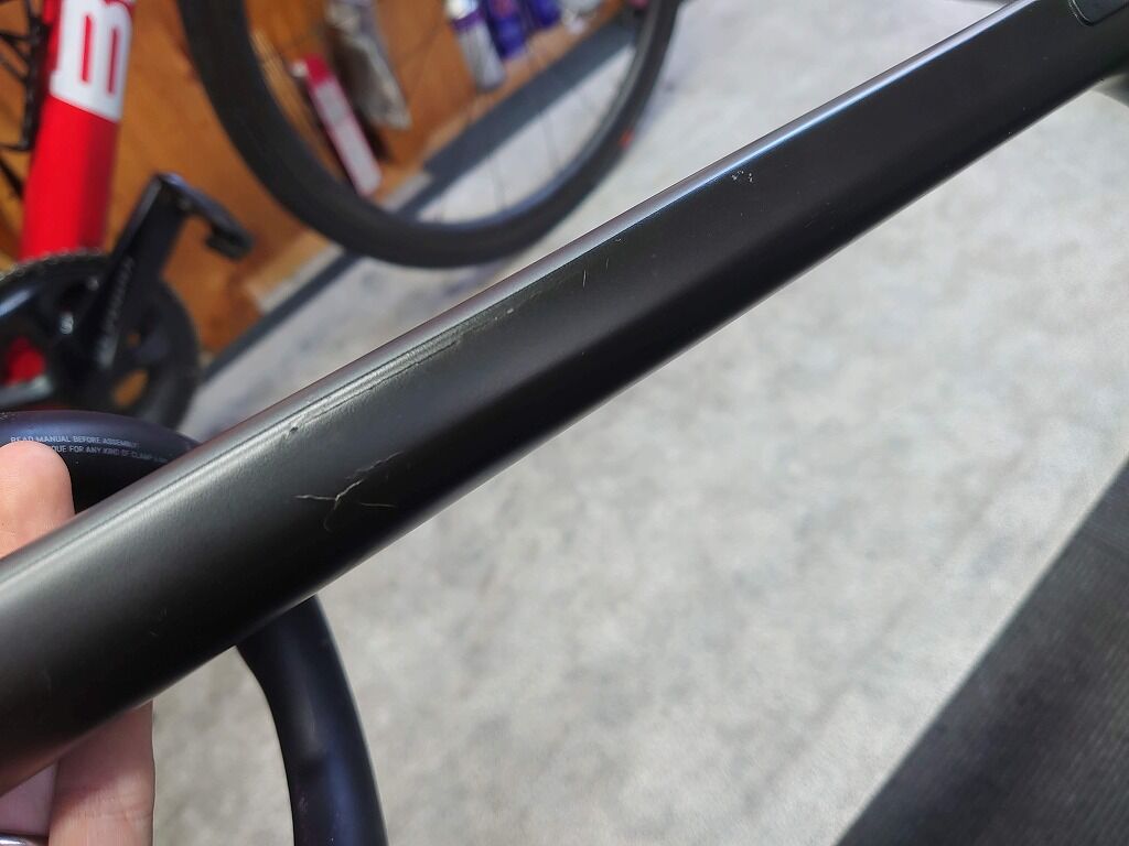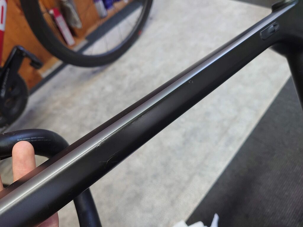 傷自体はトップチューブの左側ですが、おそらくカーボンを巻き塗装をするのでロゴが中途半端に消えてしまったり、ラインも途中で途切れてしまうと考えられます。