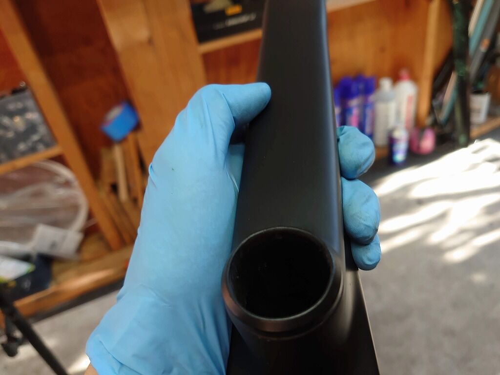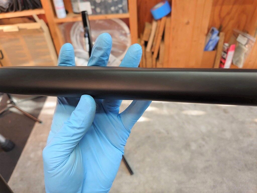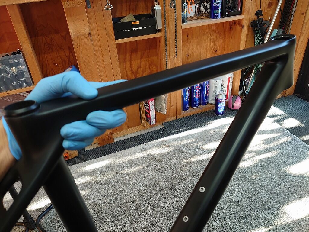 オーナー様と相談の結果、シートポスト部からヘッドチューブまで入ったシルバーのラインを残さず、ロゴも消し、マットブラックの単色仕上げにすることになりました。