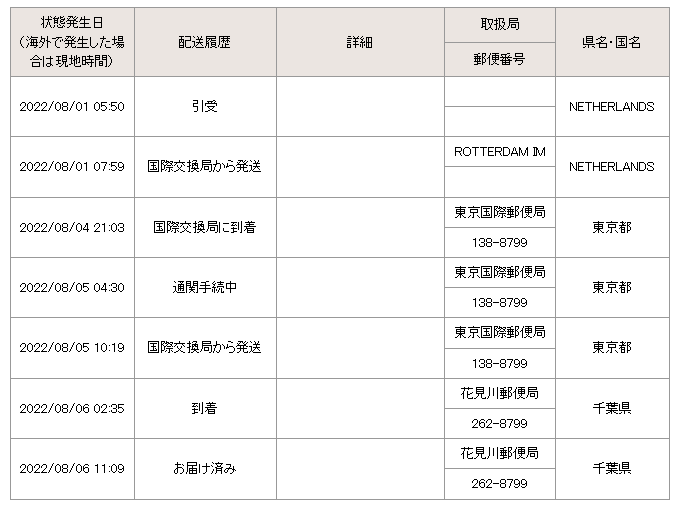 追跡番号が日本の郵便に反映されたのは8月1日(月)でした。