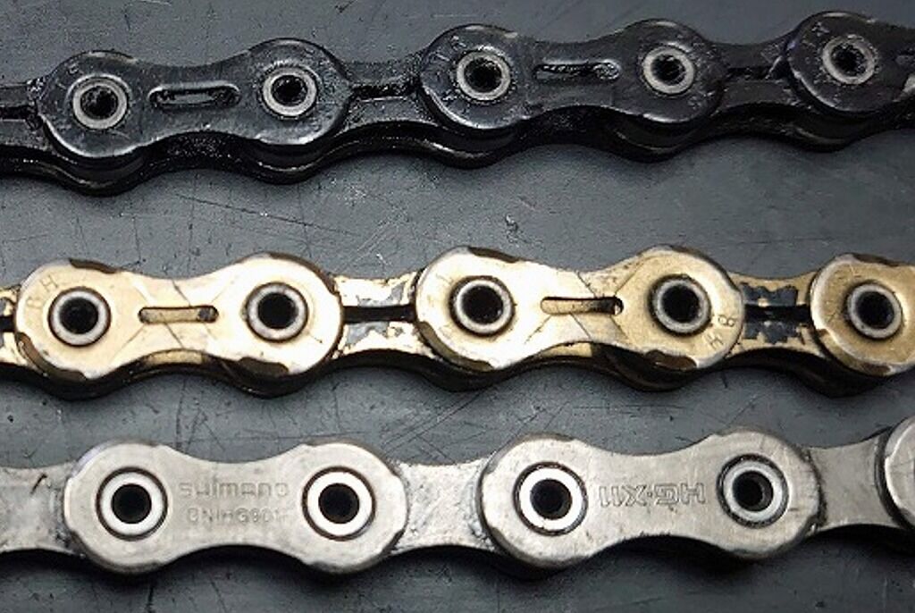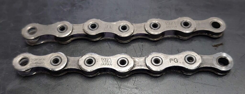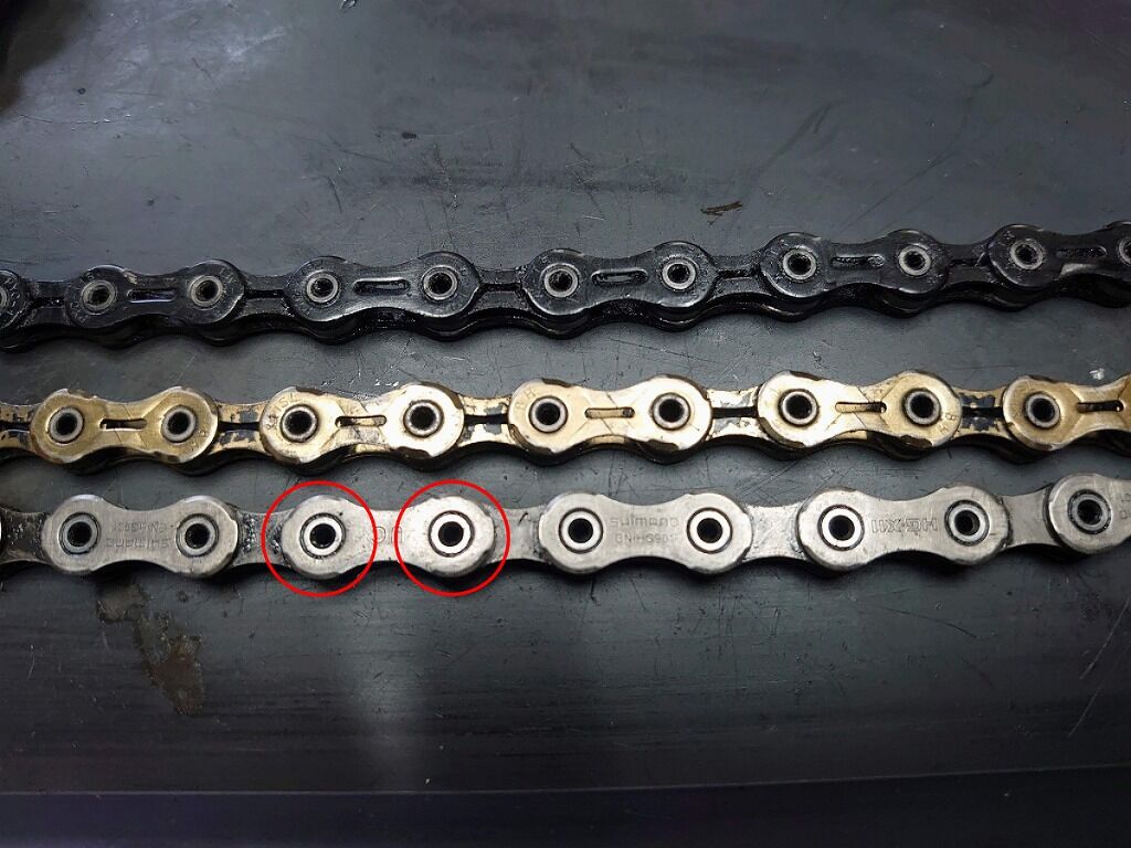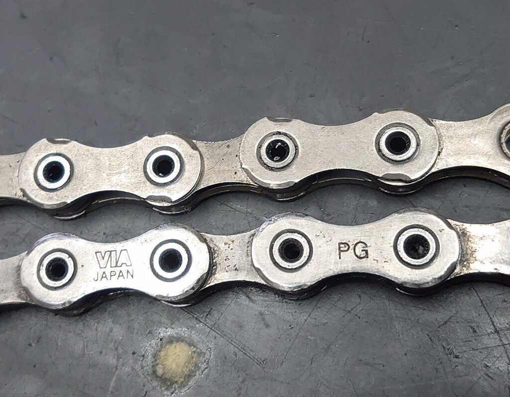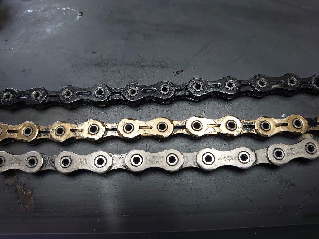 上から順番にPYCチェーン、KMC、そしてShimanoのDURA-ACEグレードのチェーンです。