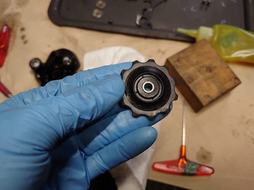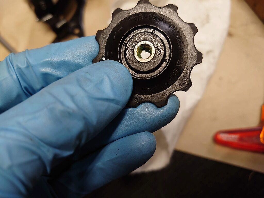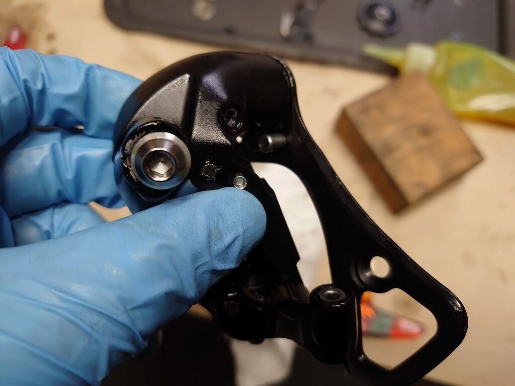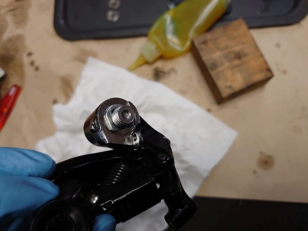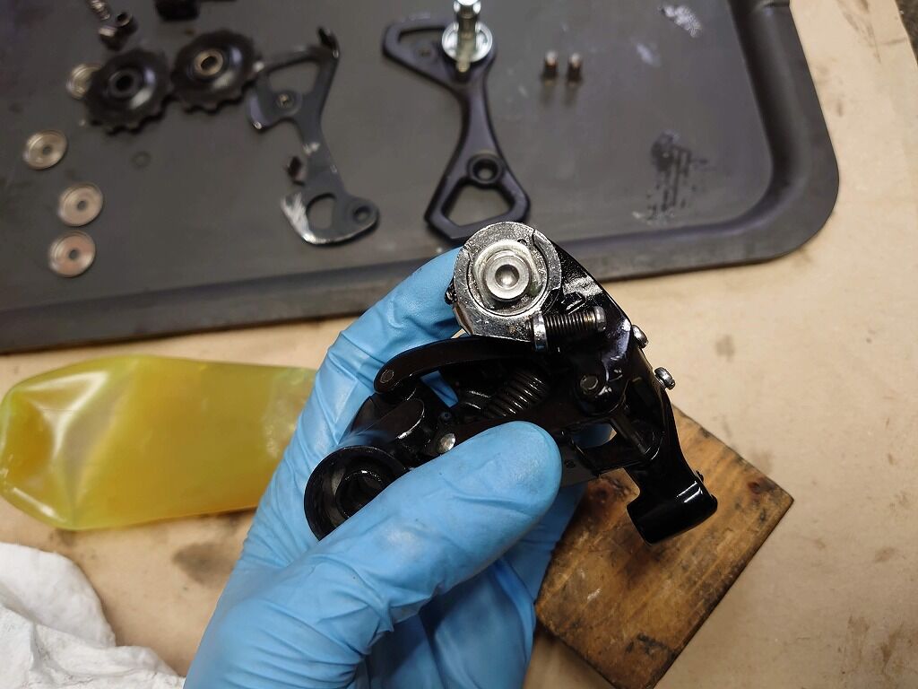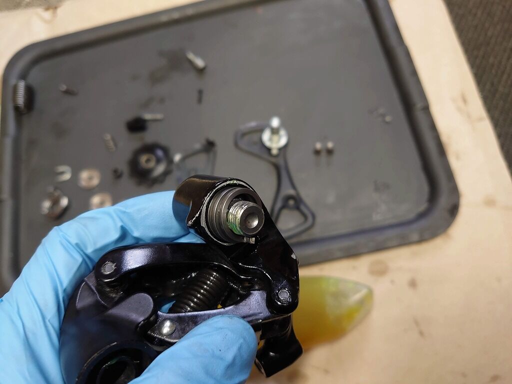 これは実際に5800よりももっと昔のモデル、もっと古く状態の悪いリアメカを触ってみるとわかるのですが、プレート軸よりもB軸の動きが悪いもののほうが多いように思えます。B軸は楽車のダメージも受けやすいと思われます。一方のプレート軸の動きが悪いのはチェーンの噛み込み等でダメージを受けた場合、汚れ方が激しい場合、特に悪くなります。