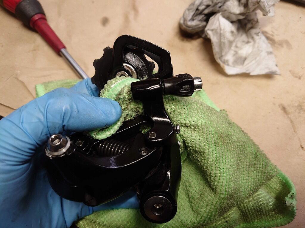 ディレイラー本体が邪魔な場合はウエス等を噛ませておくとやりやすいです。