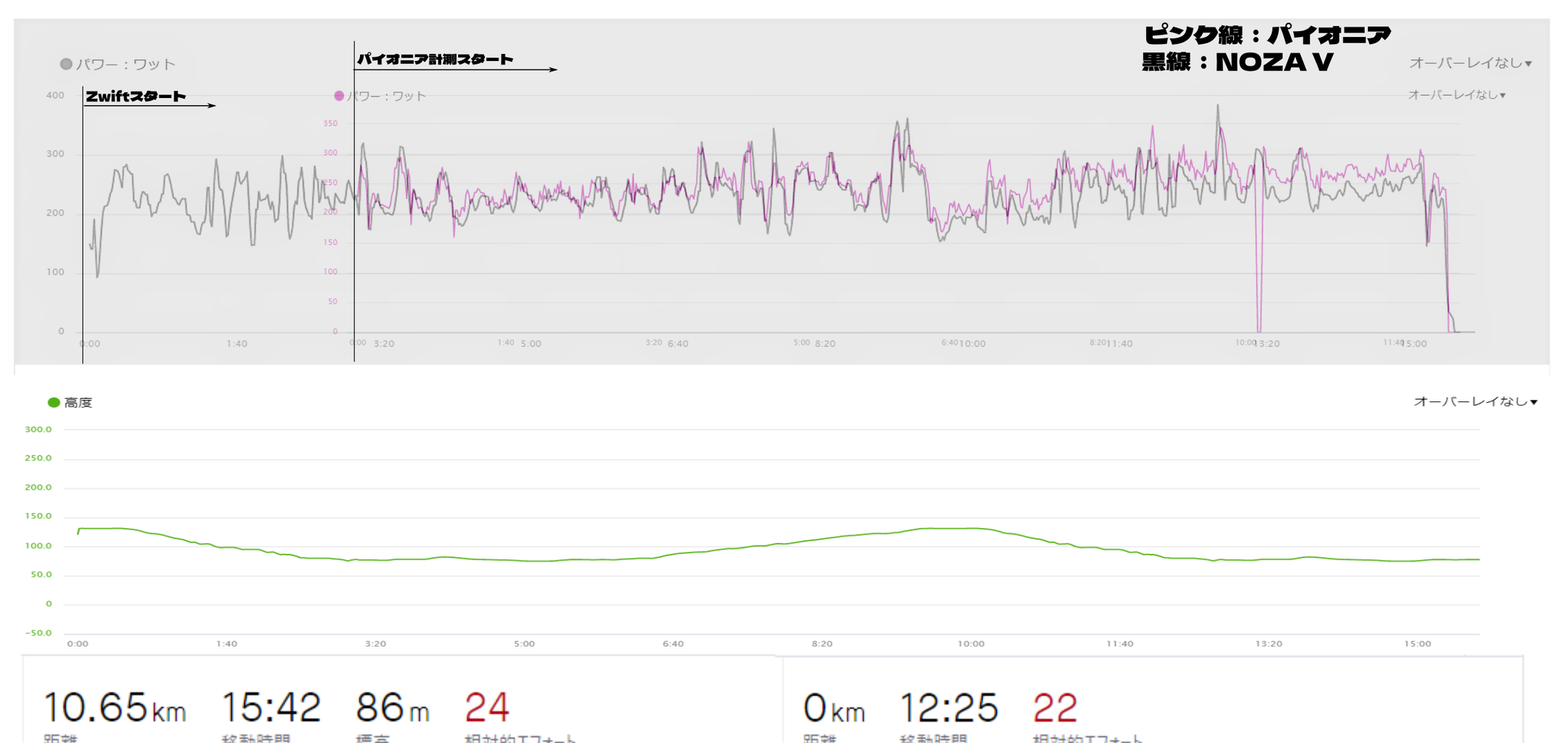 NOZA VのZwiftのパワーはZwiftで記録、パイオニアのパワーメーターの計測値をガーミンで記録、この2つをがっちゃんこしてみることにしました。