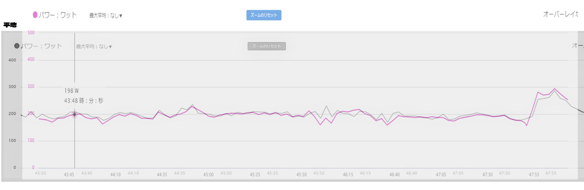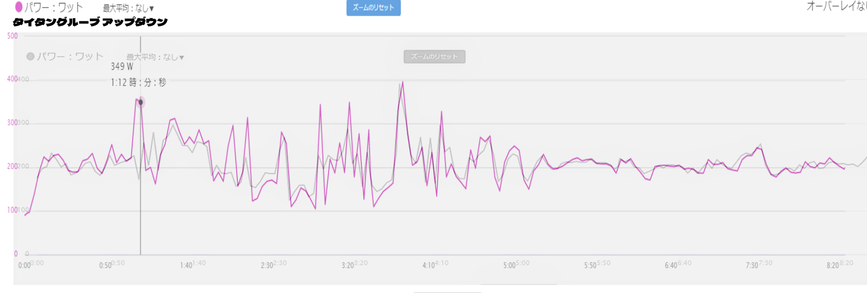 アップダウンではパワーが大きく振れ、平地(下り)に入りパワーが一定になっていきます。