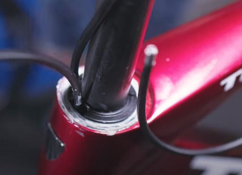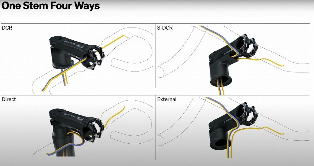 多くの場合はステム下部を通ってきてフレーム内部へと入っていきます。ステム下部を通るということは、専用品だけではなく汎用性の高い従来型のステムでも使用可能な場合が多いことがメリットです。