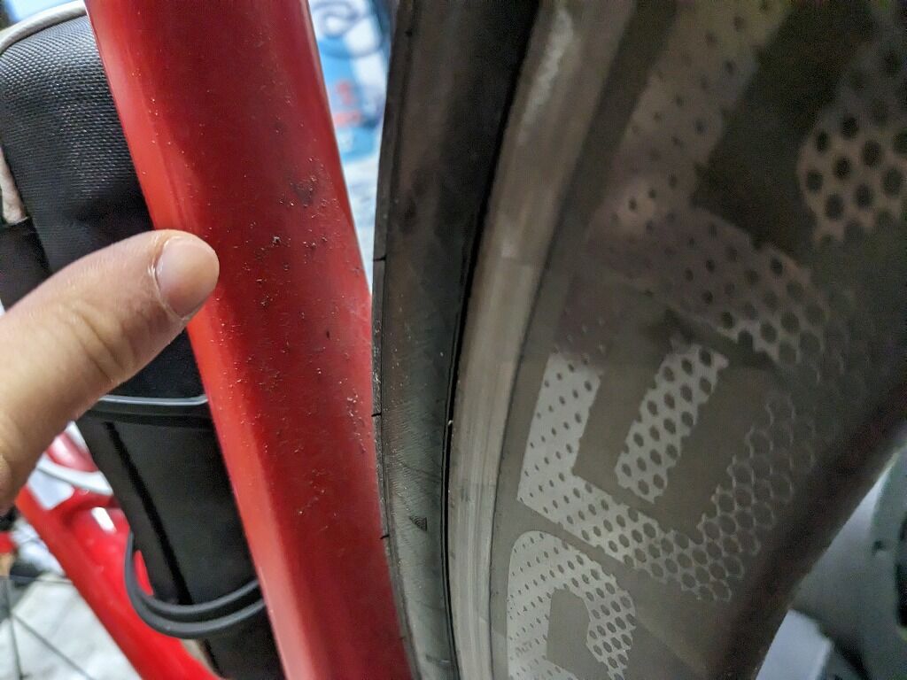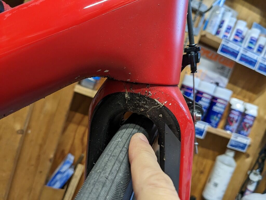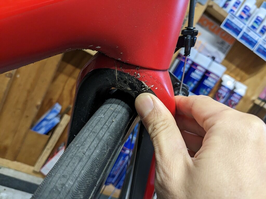 出先では気がつくことは難しいかもしれませんが、帰宅後にフレームをきれいに擦る際に前後で全く違う汚れや、落としにくい汚れがあった場合、タイヤを良くチェックすることをおすすめ致します。