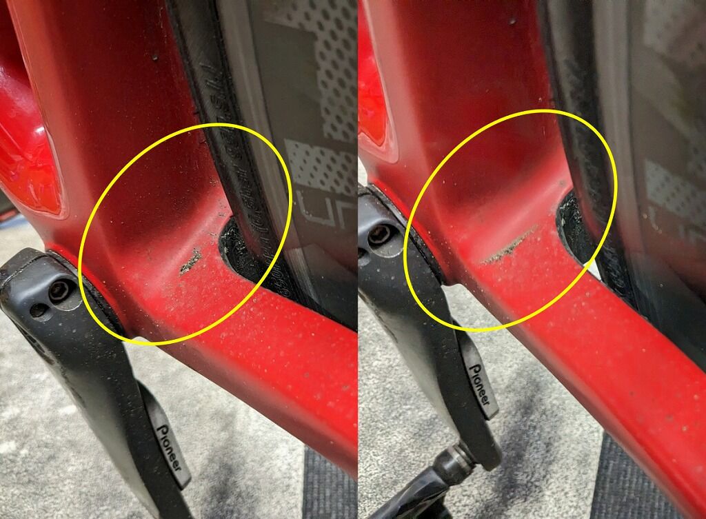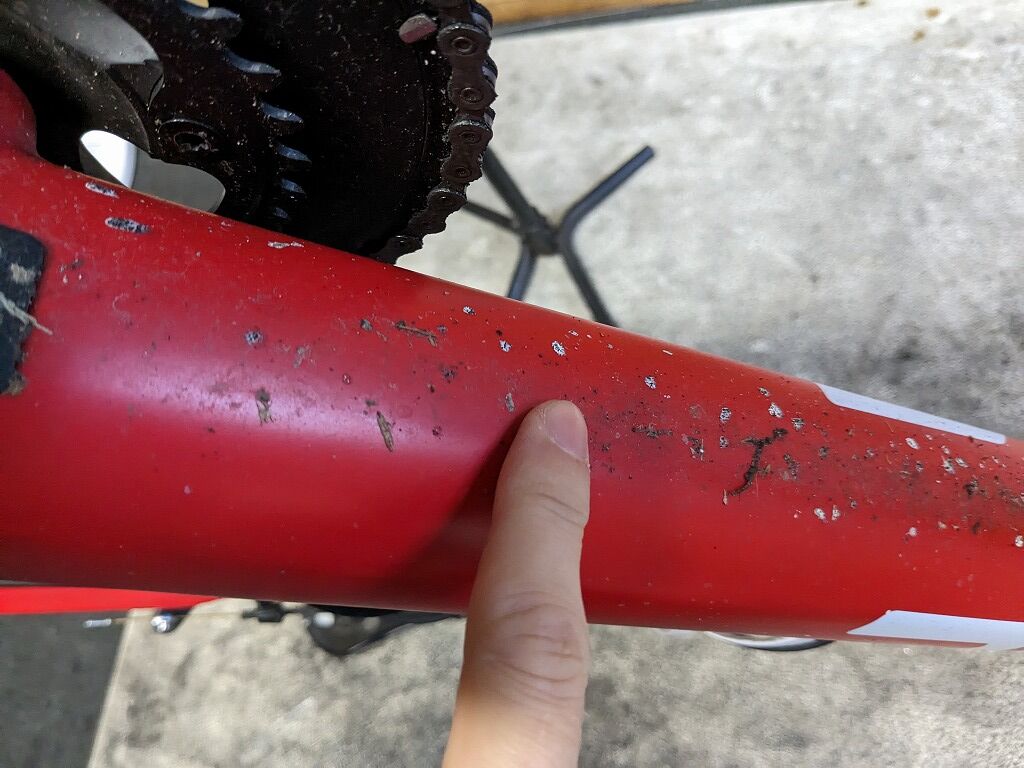 ドライ路面やきれいなところを走っている場合だと、シーラントがフレームに付着するので気が付きやすいと思います。