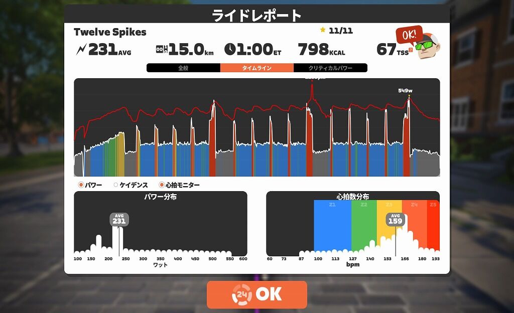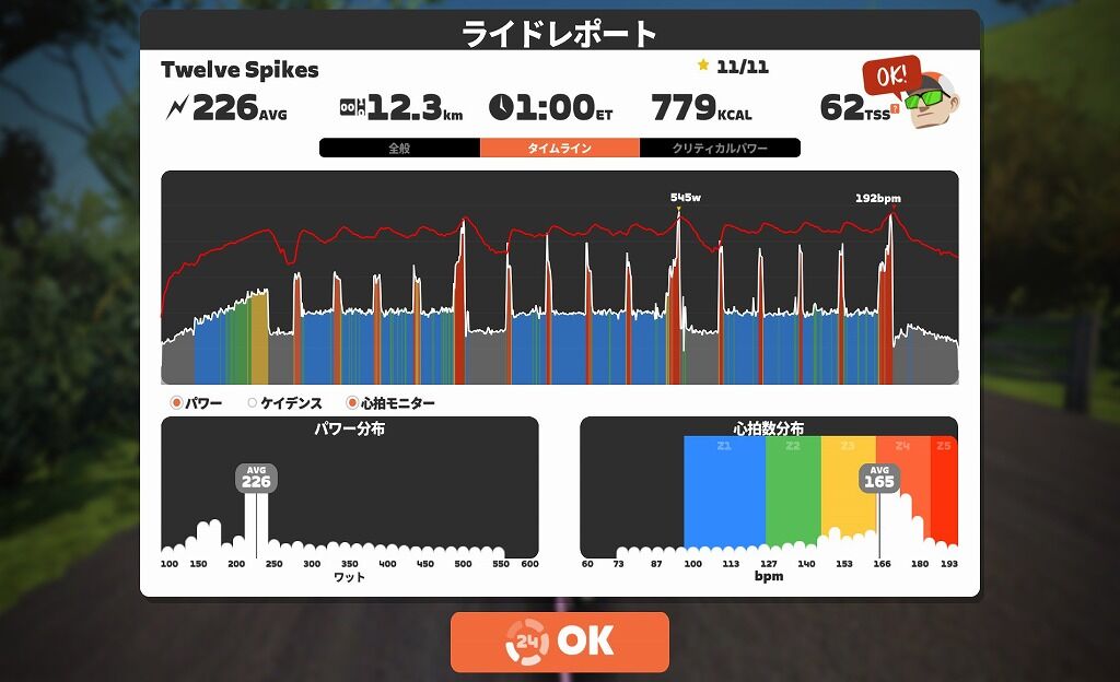こちらは体調が完全に戻ってからの同じワークアウトの12スパイクのデータです。