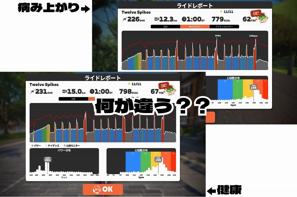 とこのように体調不良時、もしくは病み上がり(回復しきっていない場合)はと言うと、もちろん少なくとも個人差はあると思いますが、パワーが出しにくいと感じますし実際には主観通りパワーも低く、心拍数が高く出る傾向にあるようです。