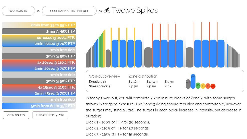 1時間のワークアウトで、ウォーミングアップはFTPの95%までのランプアップ、本セットはL2の12分の中に4本少しだけ高めの強度が短時間で入ります。12分の各セットの最後には1分間の強度指定なしのフリーライドが入ります。(フリーとはいっても滅茶苦茶あおられますが(笑))