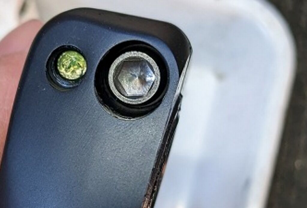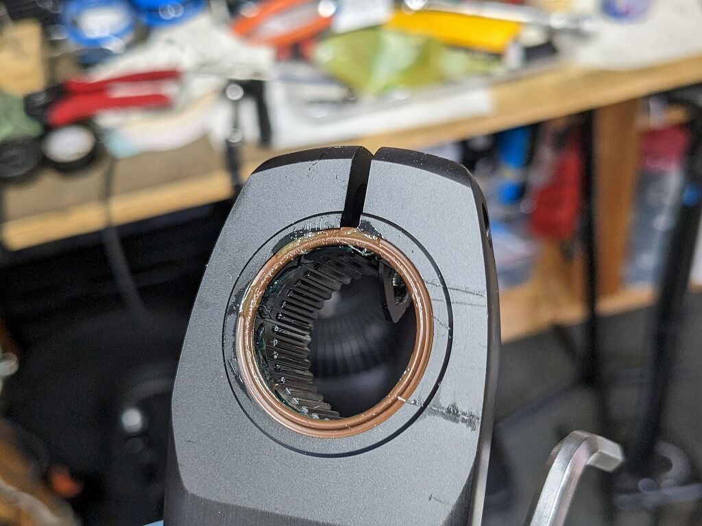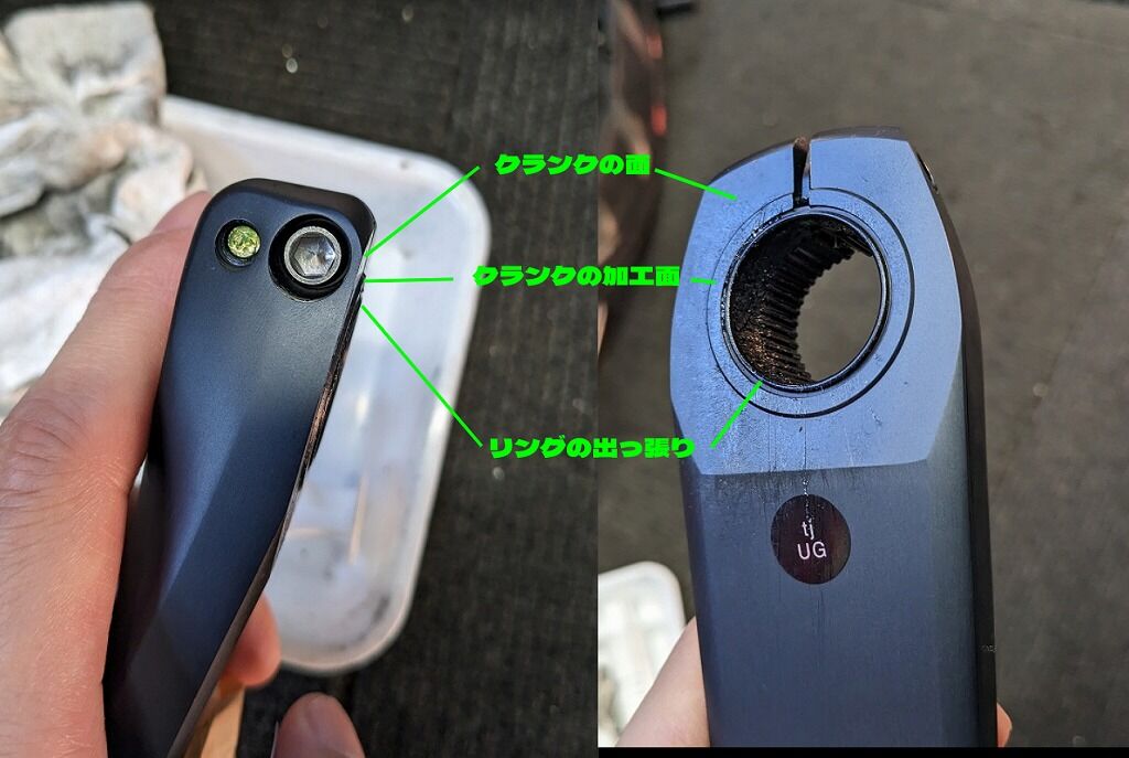 クランクの面、すこし出っ張った加工面は金属ですので硬いです。そして今回の主役のリングは多少柔らかみのある樹脂のようなもの(芯は金属製と思しき)で出来ています。