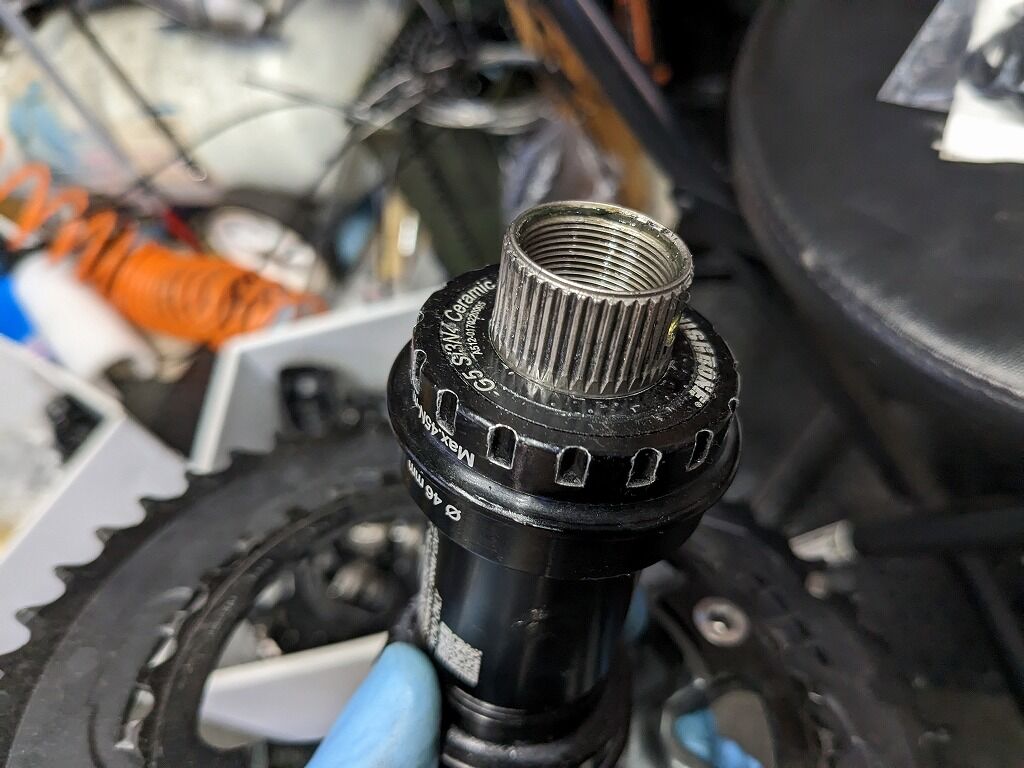 このようにクランクとのBBの接触面にお互いに高さがなければ、回転しないBBカップとゴリゴリ干渉してしまい、ひどい場合は回転できなくなってしまいます。