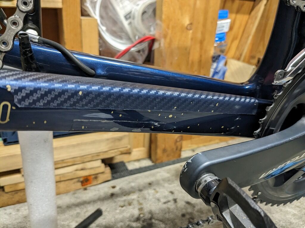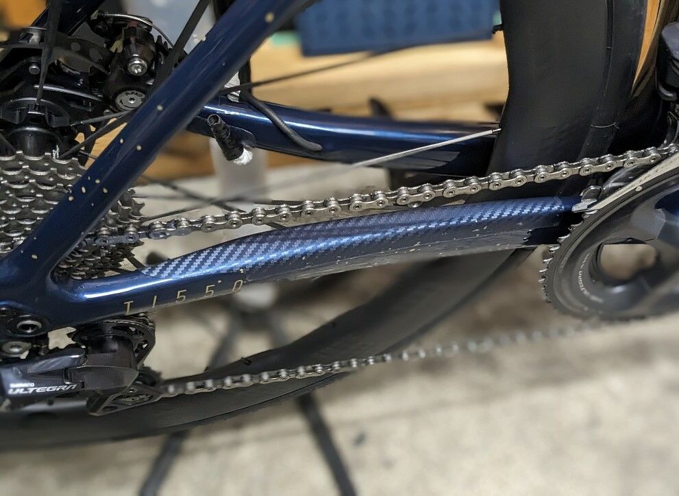 このようにプロテクションフィルムの主張はありかなしか、というのは完全に好みの問題だと思いますが、チェーンステーはBMCのときもザラザラで普通に主張の強いプロテクションフィルムが貼られていたということもあり、むしろ主張があったほうが安心感と言いますか。。。