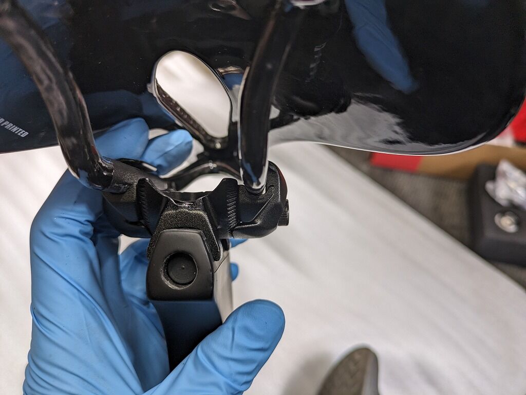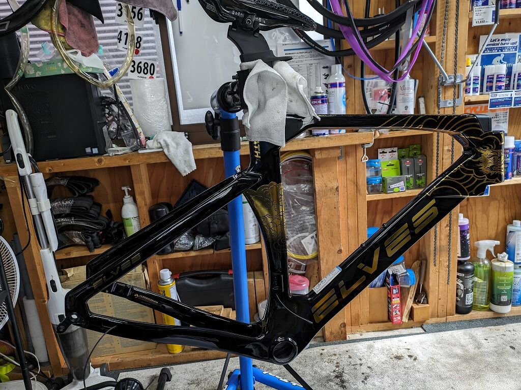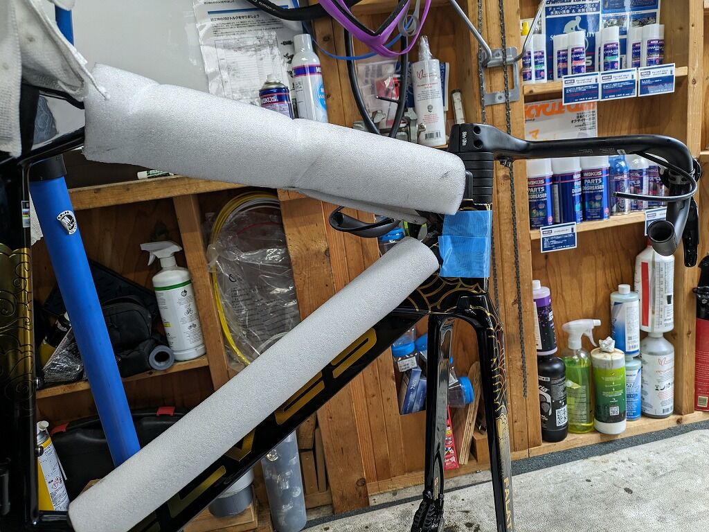 トップチューブをクランプしているように見えますが作業の便宜上、クランプはせずに乗っけているだけです。最近のカーボンフレームはトップチューブをクランプすることを禁止しているフレームが非常に多いです。というか軽量のカーボンフレームはほぼ止めたほうが良いと思います。