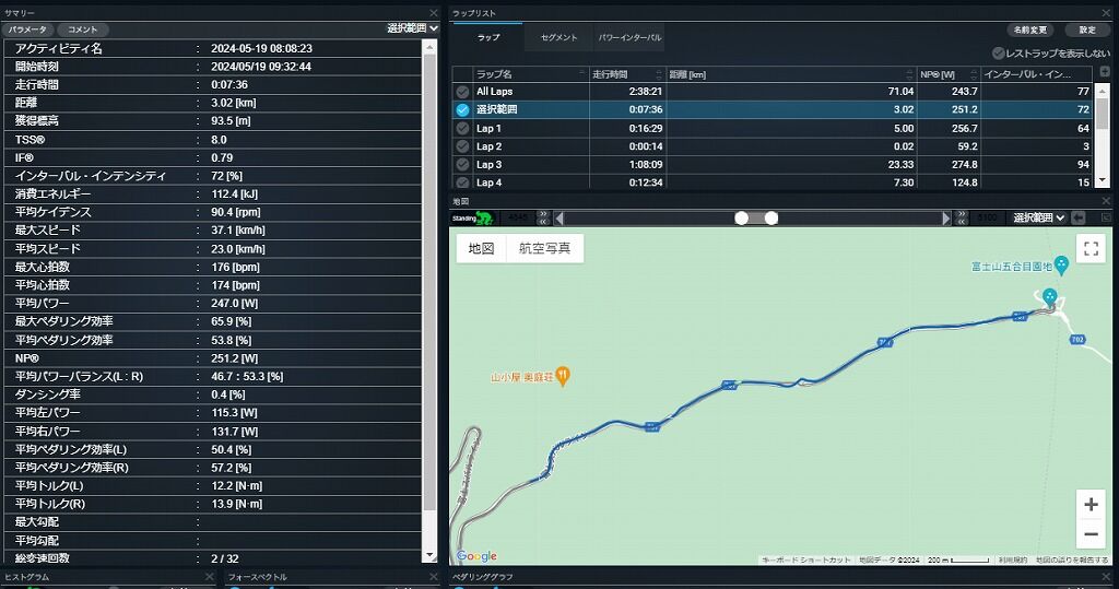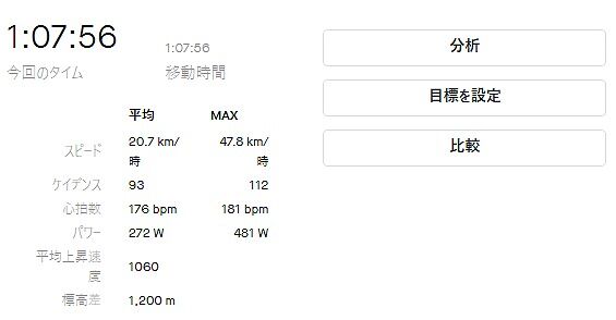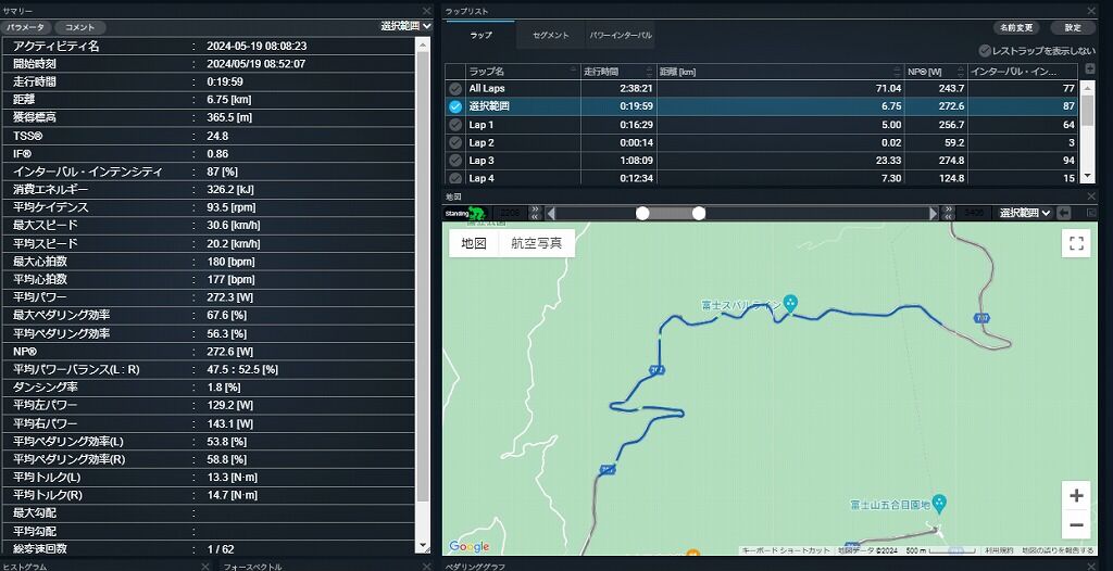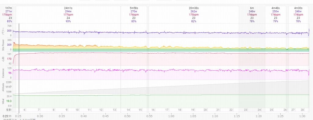 このように数値で見てみると全体の平均では272WでFTPの88%なので、やはりこのぐらいは落ちるのか、というぐらいで教科書的にはほぼほぼ的を得た数値になった、ということでした。