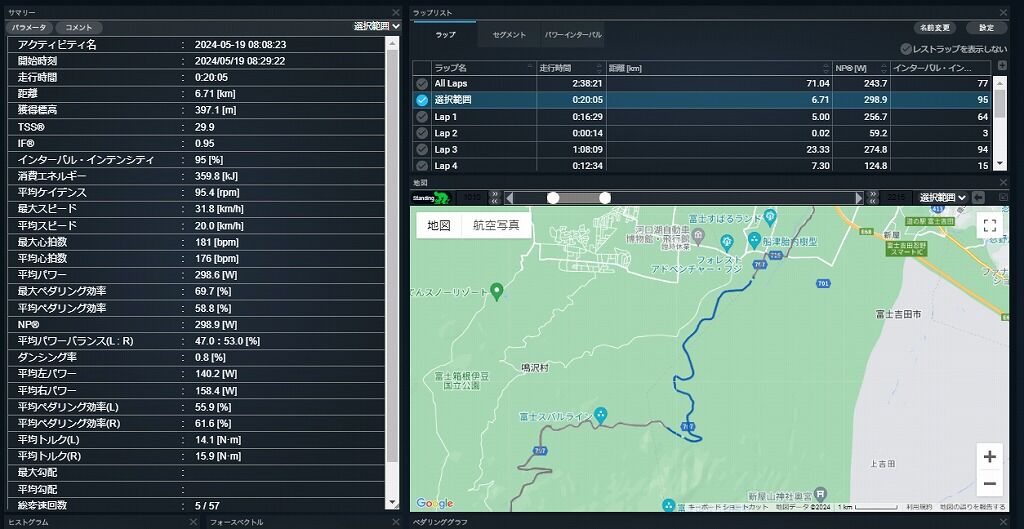 富士ヒルでは例え高地(酸素が薄い)ではなかったとしても1時間以上のヒルクライムですので、FTPを超えることは難しく、もしも309W超えたらFTP更新ということになります。(高地ということを考えれば大幅に更新です。)