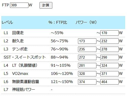 FTPは最近全く測っていませんので、今年の頭ぐらいにintervalsのeFTPで309Wという記録があるのでそれをもとに考えてみます。